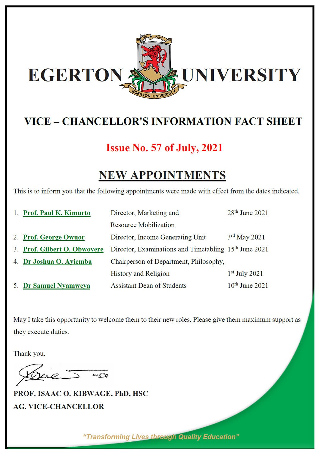 | 3. | Prof. Gilbert O. Obwoyere | Director, Examinations and Timetabling | 15th June, 2021 |