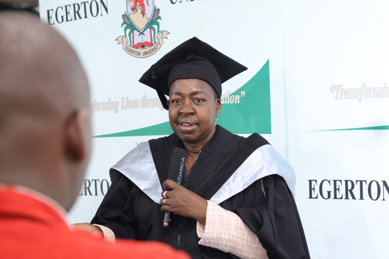 As she reflects on her academic journey, the Speaker is expressing her gratitude to her supervisors for their mentorship and guidance. “I enjoyed my stay at Egerton University. I thank my supervisors, Dr. Murenga and Prof. Erick Bor, among others, who gave me advice, mentorship, and guidance. They were very supportive and kept me on my toes,” she is saying.